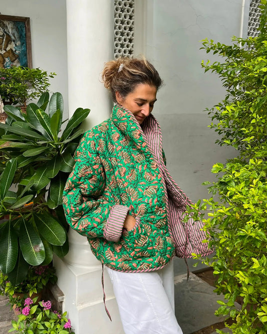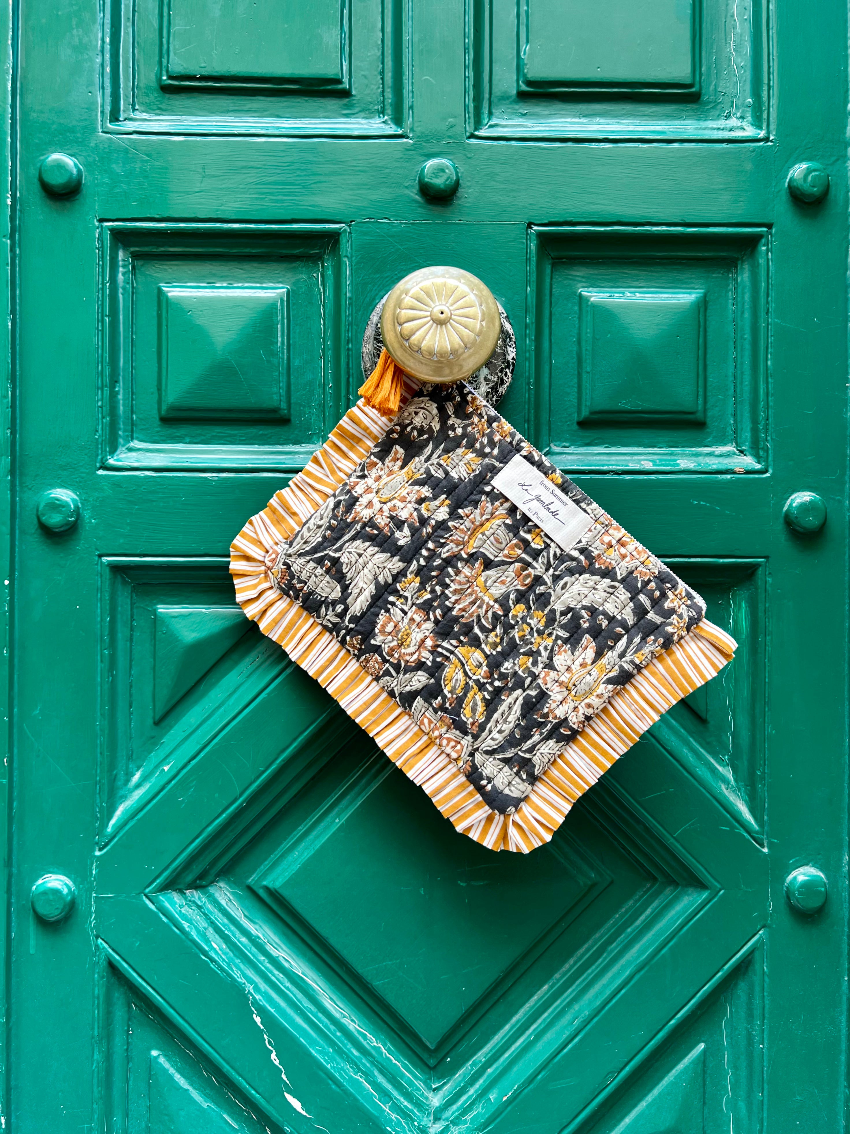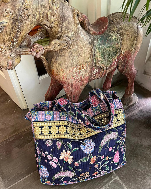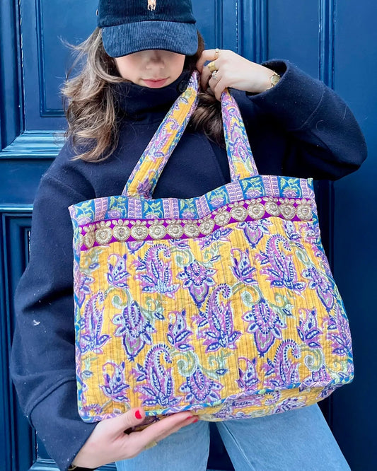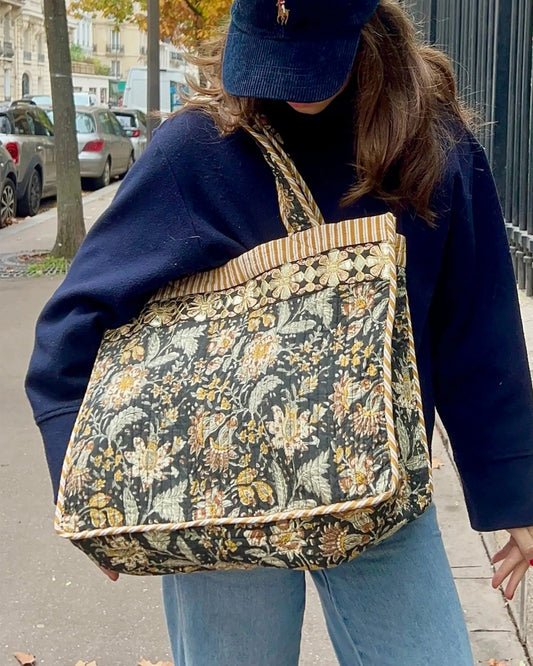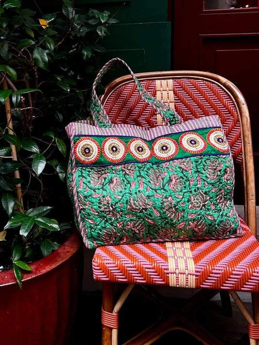 Grand Cabas "Greenflowers" vintage Indian géometrical