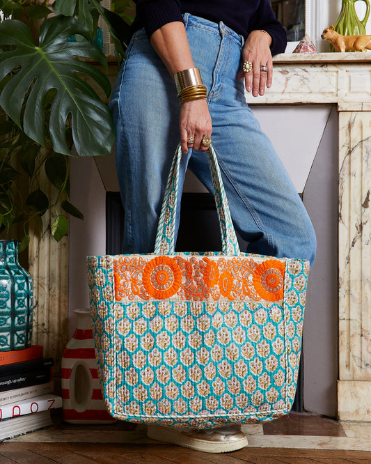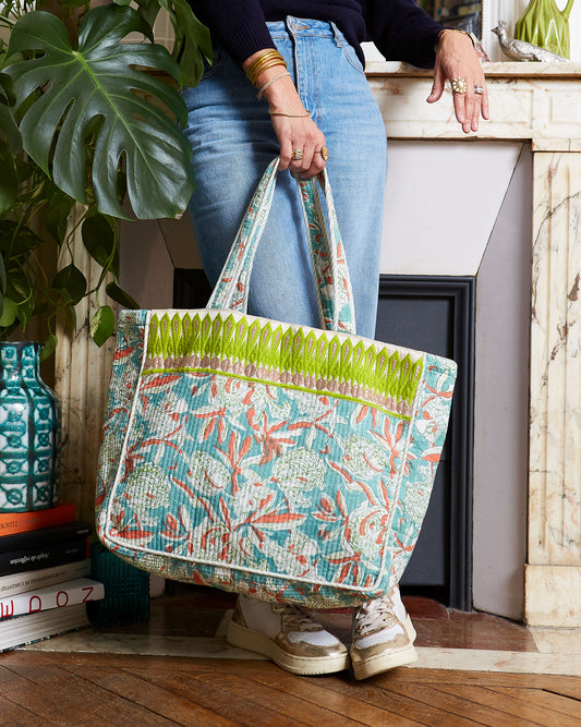 Grand Cabas "Quilted" Turquoise fleurs